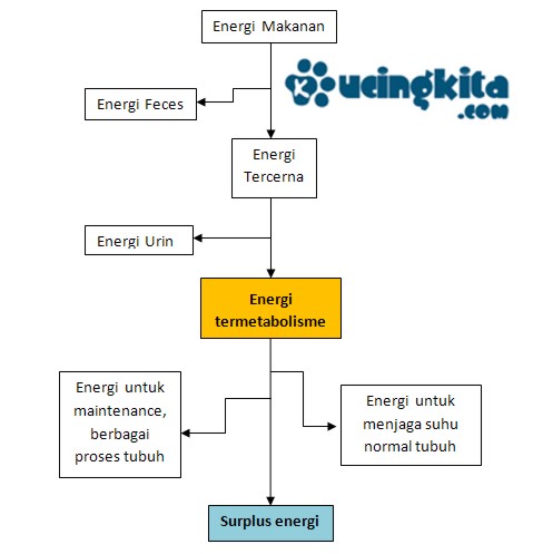 makanan yang dimakan menghasilkan dua macam "sampah" yaitu feces (kotoran/pup) dan urin (kencing), sisanya adalah energi/makanan termetabolisme (kotak kuning). Energi inilah yang bisa dimanfaatkan oleh tubuh. Percuma saja protein tinggi dan berbagai macam vitamin yang banyak dalam makanan tetapi tidak bisa dicerna dan dimetabolisme tubuh karena dibuang jadi feces atau urin.